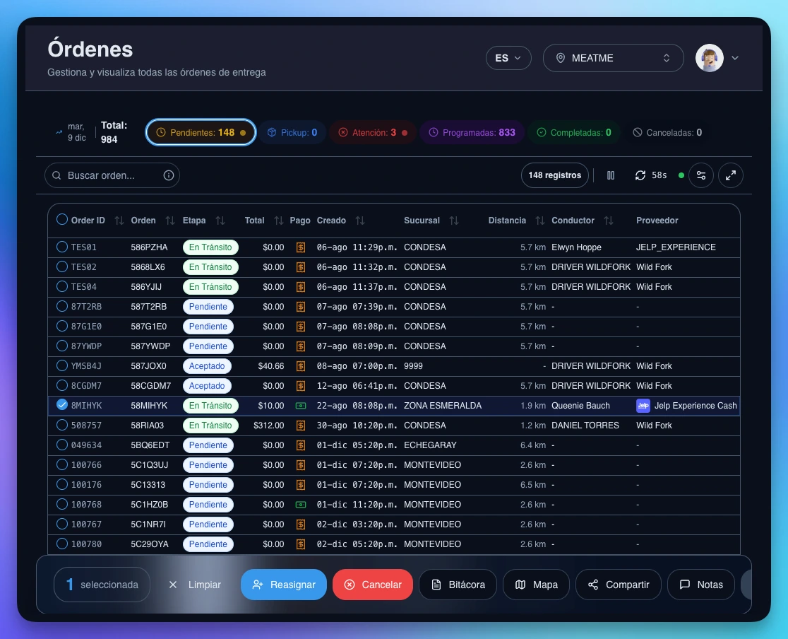 Controla y dirige miles de pedidos al instante. Nuestro dispatcher te da el poder de decidir quién, cómo y cuándo entregar cada pedido, maximizando velocidad y ahorro.